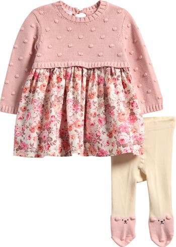 Baby will stay cozily warm while looking adorable in this set featuring a mixed-media dress paired with footed leggings.