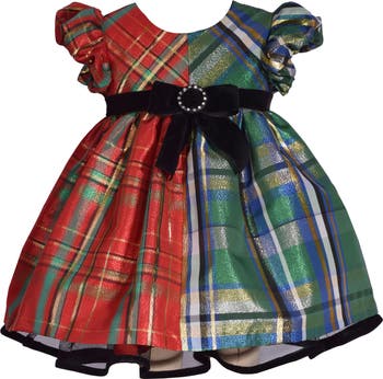 Shimmery threads lend playful appeal to this taffeta dress made to show baby off with colorblocked plaid patterning and a soft velvet bow.