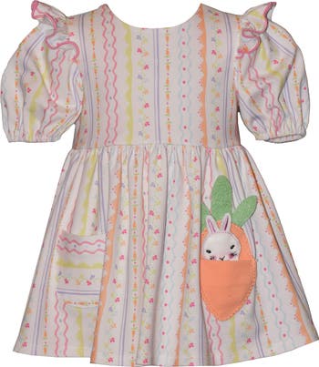 Baby will be ready for spring in this charming dress defined by a bunny appliqué and carrot stripes.