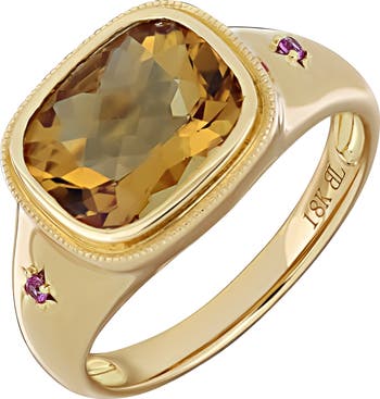 A vibrant citrine stone, set in a sleek bezel, adds instant glamour to this 18-karat gold ring with a signet-inspired silhouette. Twin pink sapphires adorn the sides for added sparkle.