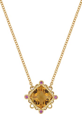 A vibrant citrine stone, set in a sleek bezel, adds instant glamour to this pendant necklace crafted from gleaming 18-karat gold. Four crown-set pink sapphires adorn the sides for added sparkle.