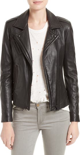 With its exposed silvertone zips, notch snap collar and shoulder epaulets, this supple lambskin leather jacket embodies quintessential moto style.