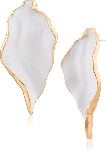 An iridescent sheen and warmly plated trim lend shimmer and shine to stylish earrings crafted with free-form edges that give off a boho vibe.