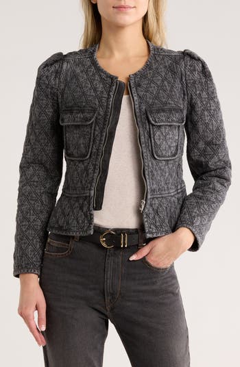 Double-stitched diamond quilting updates a cropped denim jacket perfected by chic flap pockets and subtly puffed shoulders.
