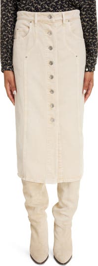 This season-staple denim skirt is designed in a longline silhouette with silvery buttons marching down the front.