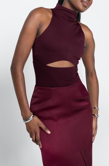 Destined for date night, this sleek body-contouring top is designed with a sophisticated high neck and sultry skin-showing cutouts.