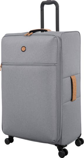 Water-resistant and expandable softside fabric is reinforced with a lightweight frame and gliding spinner wheel for durable luggage with effortless airport navigation.