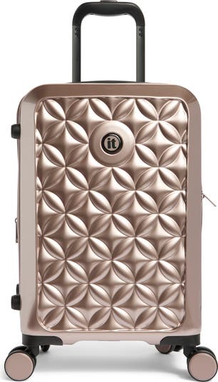 Exterior features: Versatile polypropylene material with a textured surface ensures lightweight durability and protection. A telescoping handle maximizes comfort and control for users of different heights. Four double-wheel spinners glide effortlessly to navigate through busy airports.
