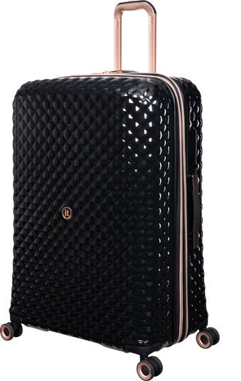 Exterior features: Scratch-resistant ABS material with textured surface ensures lightweight durability and protection. A telescoping handle maximizes comfort and control for users of different heights. Eight-wheel spinners glide effortlessly to navigate through busy airports.