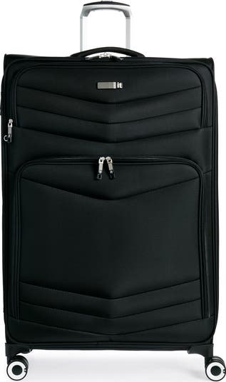 Water-resistant and expandable softside fabric is reinforced with a lightweight frame and gliding spinner wheel for durable luggage with effortless airport navigation.