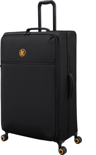 Exterior features: Water-resistant polyester material ensures lightweight durability and protection. A telescoping handle maximizes comfort and control for users of different heights. Four double-wheel spinners glide effortlessly to navigate through busy airports.