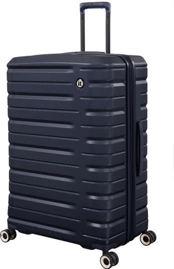 Exterior features: Water-resistant ABS material with a textured surface ensures lightweight durability and protection. A telescoping handle maximizes comfort and control for users of different heights. Four double-wheel spinners glide effortlessly to navigate through busy airports.