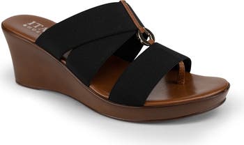 Elastic straps enhance the comfort of a thong-toe slide sandal finished with O-ring hardware and lifted by a comfortable wedge heel.