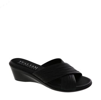Textured crisscross straps shape an open toe slide sandal that is set on a comfortable mid wedge heel.