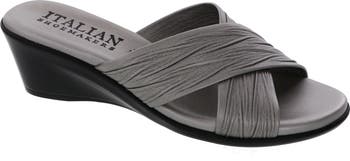Textured crisscross straps shape an open toe slide sandal that is set on a comfortable mid wedge heel.