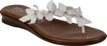 Jewel-embellished floral appliqués add a dose of whimsy to a minimalist flip-flop secured with a center toe post.
