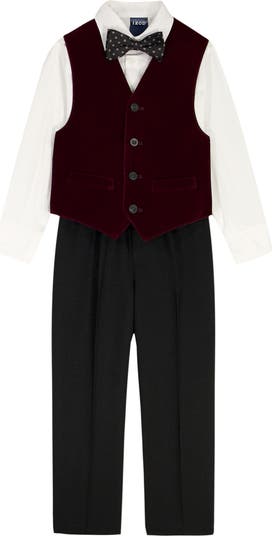 Your dapper darling will look perfectly polished in a set that features a smart bow tie, button-up shirt, soft velvet vest and pants.