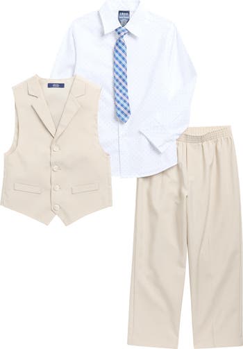 - Set includes button front shirt, tie, vest and pants