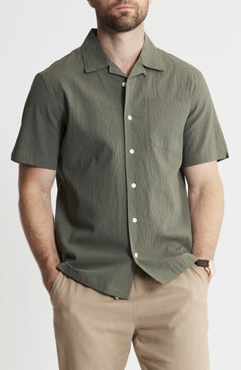 Richly textured, this short-sleeve camp shirt cut from stretchy seersucker fabric is a laid-back addition to any wardrobe.