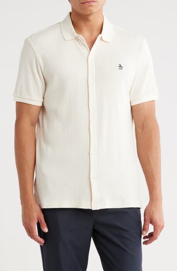 Cotton-rich jacquard and an embroidered penguin add a touch of texture and signature style to this short-sleeve button-front shirt that's always a smart option.