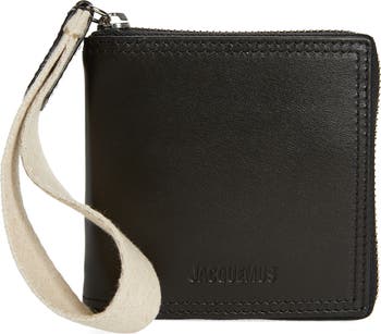 A convenient wrist strap offers hands-free portability for this square leather card holder furnished with a zip-around coin pouch and slots for essential cards.