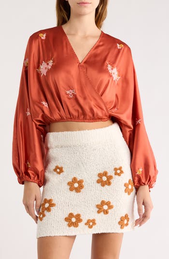 Refresh your off-duty looks with this lustrous satin top framed with billowy sleeves and covered in embroidered blooms.