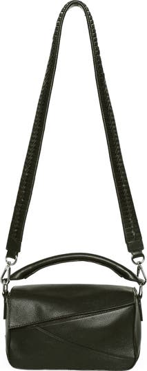 An asymmetric flap heightens the contemporary appeal of a soft leather crossbody bag fashioned with a removable strap for instant versatility.