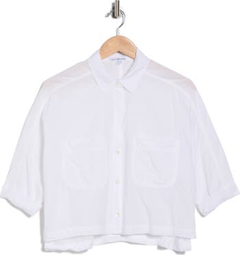 A cropped silhouette lends skin-baring appeal to a button-up shirt cut from pure cotton for a breezy fit even on hotter days.