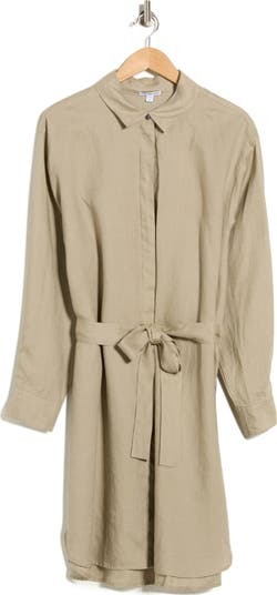 A sharp collar and cinchable waist tie add refined detailing to this flowy shirtdress cut from a crisp, breathable blend of cotton and linen.