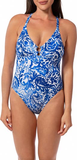 Internal panels are designed to mold and sculpt the fit of a one-piece swimsuit made with full coverage for comfort whether lounging or swimming.