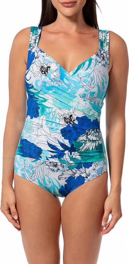 A gathered bodice shapes the flattering silhouette of a resort-ready one-piece swimsuit supported by fully adjustable shoulder straps.