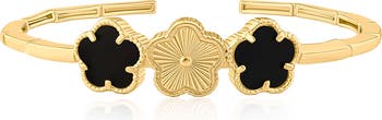 Boost your look with the shine of this flexible cuff bracelet boasting a trio of clovers accented by faux onyx and detailed engraving.