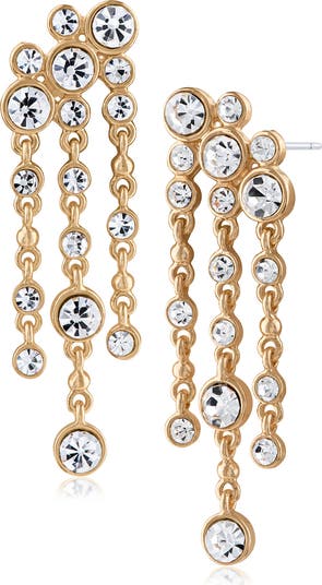 Bezel-set crystals cascade down these multichain drop earrings that sparkle with every step.