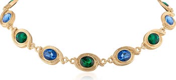 Blue and green crystals trace this vintage-inspired collar necklace that brings elegant sparkle to your looks.