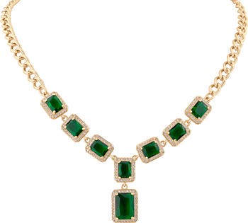 Emerald-cut green crystals with sparkly crystal halos trace this polished Y-necklace that brings instant glamour to your night-out looks.
