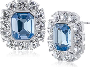 Show off glamorous sparkle with these statement stud earrings featuring blue rectangular crystals framed by white round crystal halos.