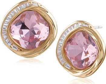 Adorn your lobes with these pink-hued faceted stud earrings surrounded by baguette pavé.
