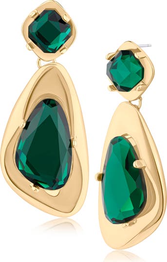 Show off glamorous shine with these bold crystal-embellished earrings suspending fluid, organically shaped drops.