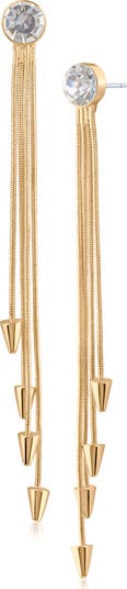 Show off striking shine with these sparkly crystal earrings suspending fluid snake-chain drops capped by gleaming spikes.