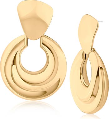 Exude sophisticated shine with these sculptural square doorknocker drop earrings plated in gleaming goldtone.