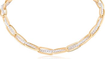 Twisted paper-clip links illuminated by pretty faux pearls defines a polished necklace that lends an air of elegance to casual or elevated looks.