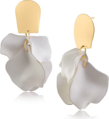 Elevate your style with these artfully designed drop earrings featuring a delicate ginkgo-flower drop and goldtone plate stud that gives a glistening finish.