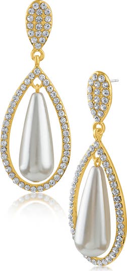 Show off elegant sparkle with pavé crystal earrings suspending teardrop frames and imitation pearl drops.