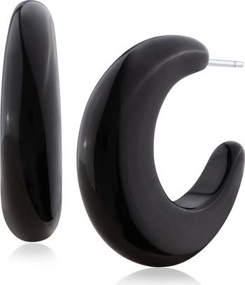 Blush sculptural hoops lend contemporary elegance to both daytime and evening ensembles.