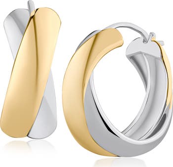 A striking two-tone finish emboldens the look of polished hoop earrings forged in a crossover silhouette for on-trend appeal.