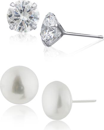 Illuminate your stack with this set of stud earrings held in sterling silver settings and complete with shimmering cubic zirconia and lustrous cultured pearls.