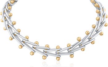 Gleaming barbells frame V-shaped links on this striking collar necklace boasting a glossy two-tone finish.