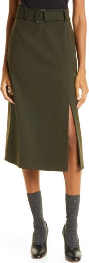 A slightly flared A-line shape defines a staple skirt with a D-ring belt and a deep side slit to let you move easily through your busy day.