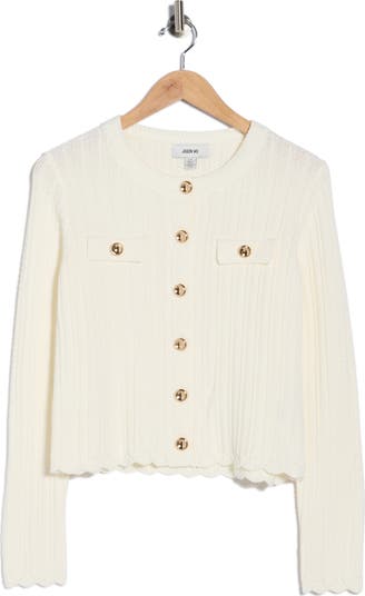 Gleaming buttons enhance the polished style of this cotton pointelle cardigan knit in a sweetly cropped silhouette edged by scalloped trim.
