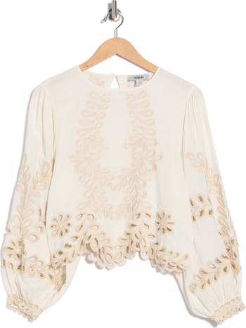 This linen‑blend top features long puff sleeves and delicate eyelet embroidery for a light, romantic finish.